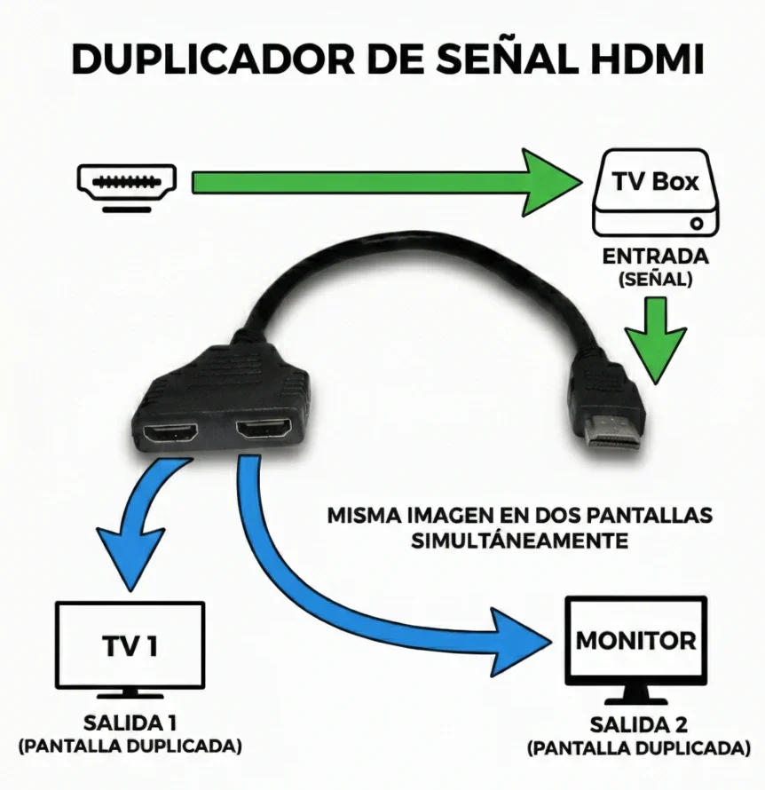 (1) Cable Splitter HDMI de 1 entrada (Macho) a 2 salidas (Hembra). El producto se entrega listo para usar, sin necesidad de cables de alimentación extra ni software de instalación, diseñado para una integración inmediata en tu sistema de entretenimiento o trabajo.