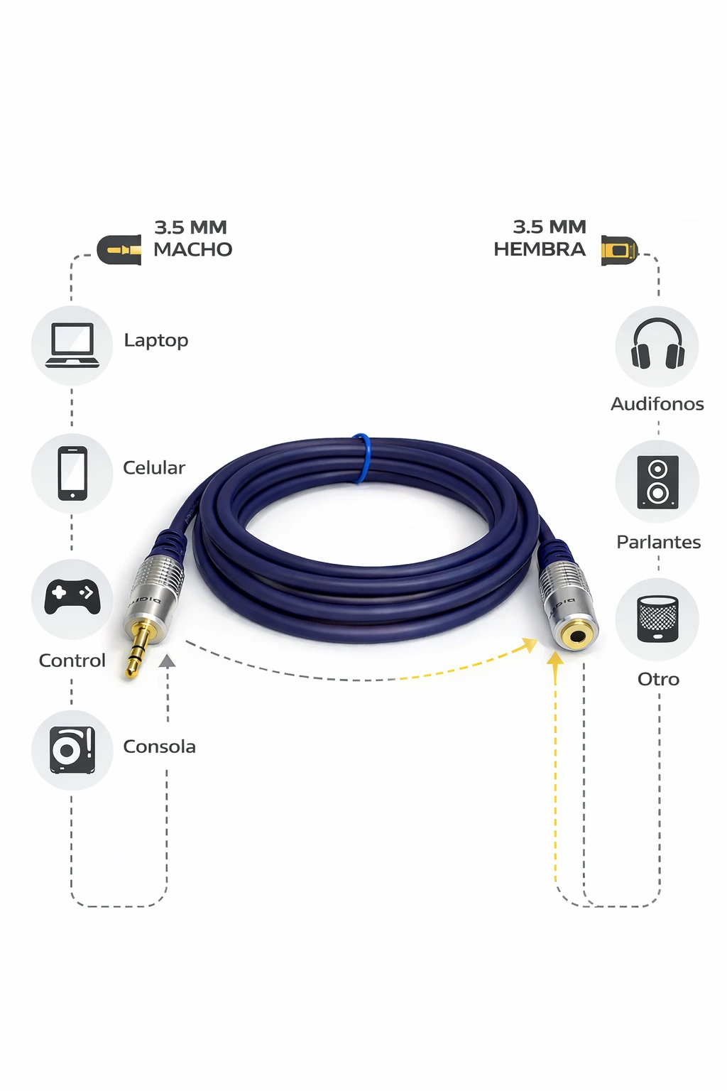 • Conector universal 3.5mm macho a hembra, compatible con celulares, laptops, PC, tablets, consolas, parlantes y reproductores de audio.